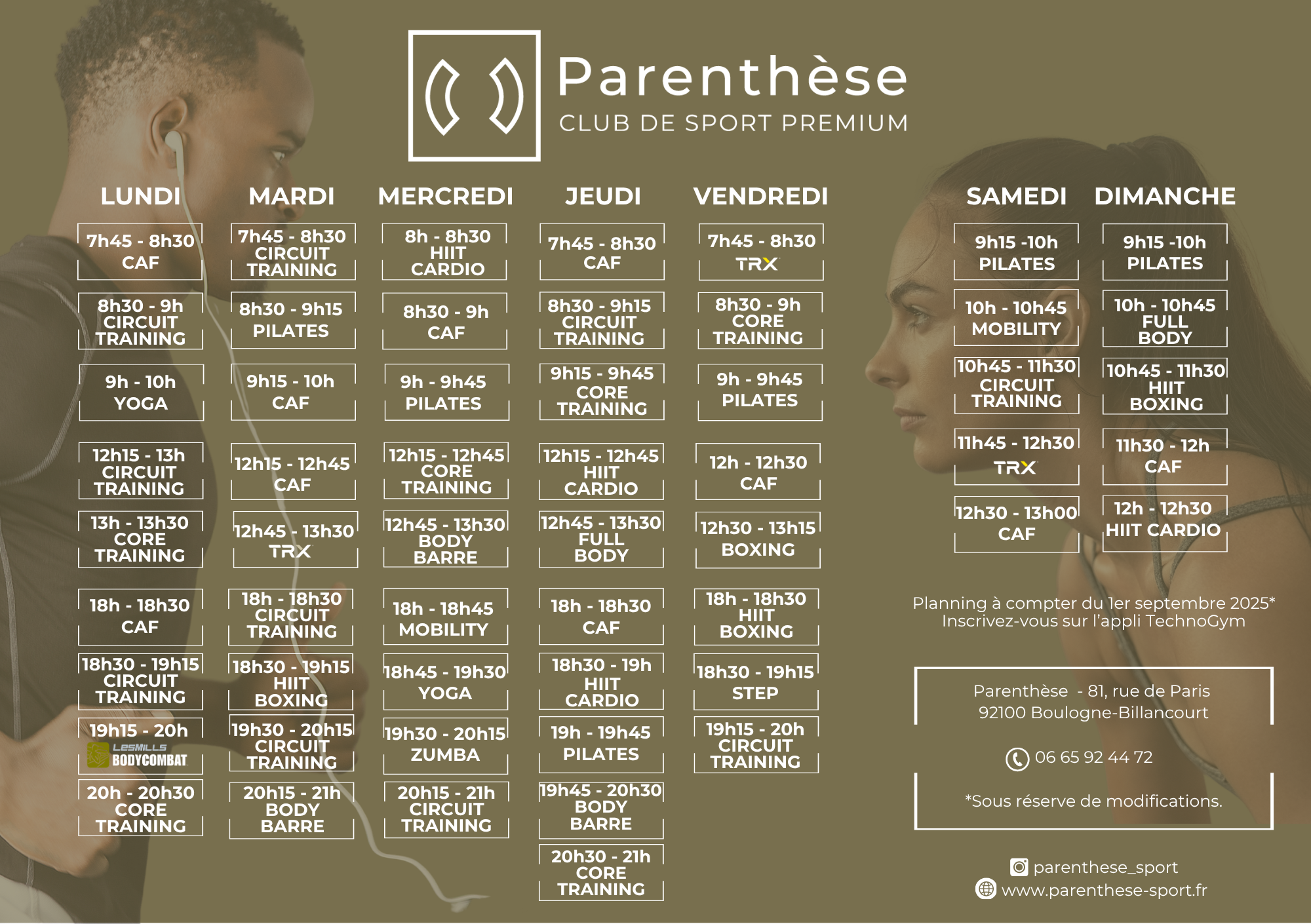 Chez Parenthèse, nous sommes ravis de vous offrir une sélection étendue de cours collectifs, conçue pour répondre à toutes les envies et à tous les niveaux de fitness. Avec 55 cours par semaine couvrant 15 disciplines différentes, notre programme est pensé pour vous permettre de trouver l'équilibre idéal entre défi et plaisir. Profitez de cette offre complète dans un environnement premium et accueillant, spécialement aménagé pour enrichir votre expérience sportive.