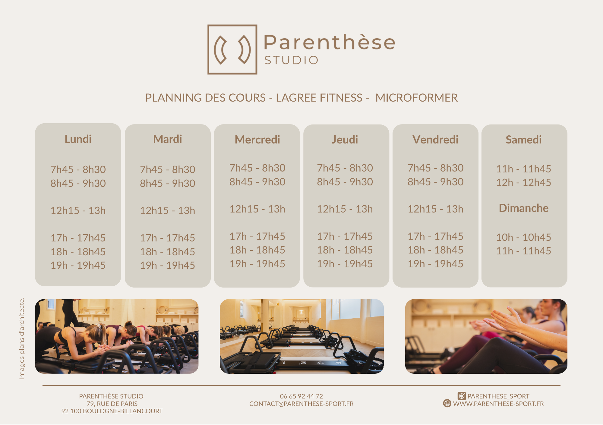 Notre équipe sera également ravie de vous accueillir pour vous présenter l’offre Lagree Parenthèse Studio (accueil au 81, rue de Paris).